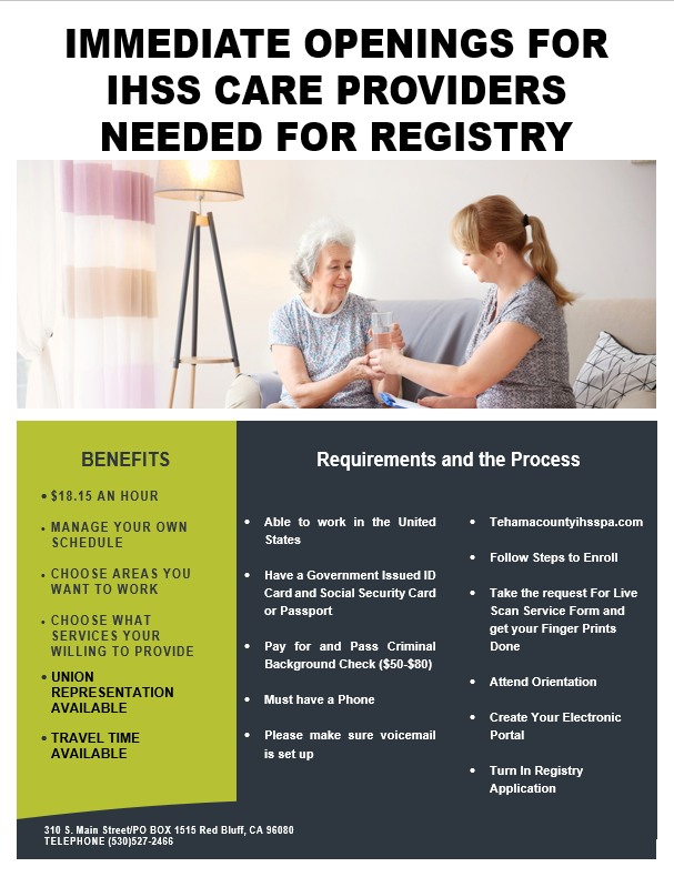 All Tehama County IHSS Recipients and their Care Providers will be required to submit and approve their timesheets via the Electronic Services Portal (ESP) or by phone via the Telephone Timesheet System (TTS).